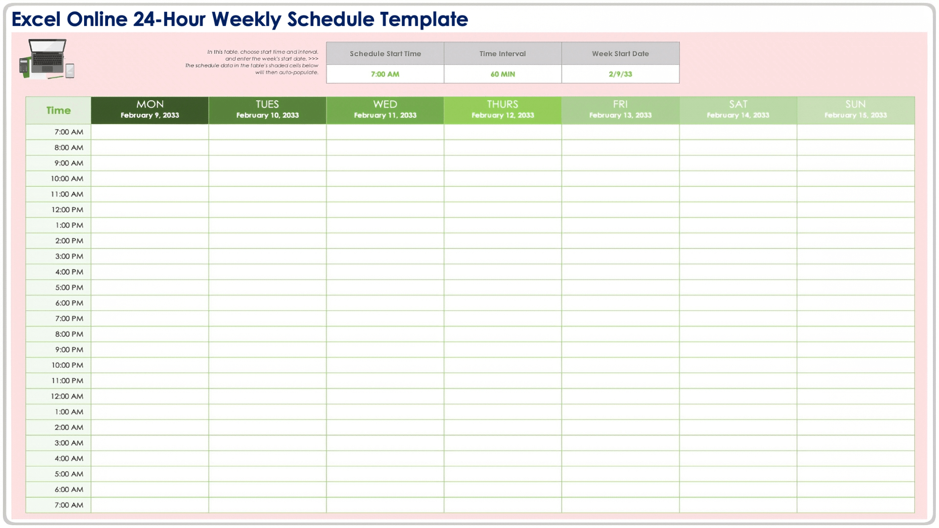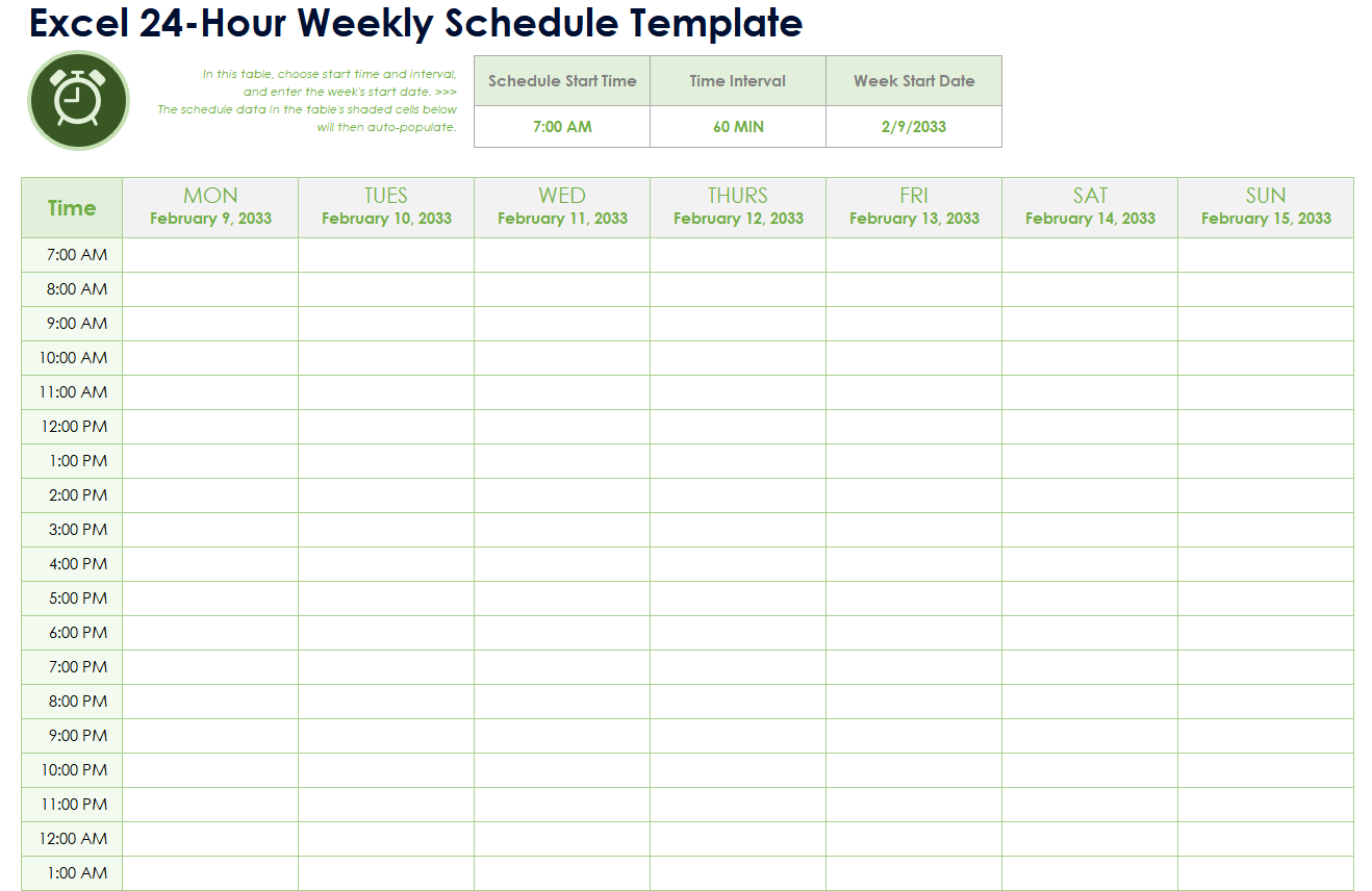 Excel 24hr Weekly Schedule Printable Template