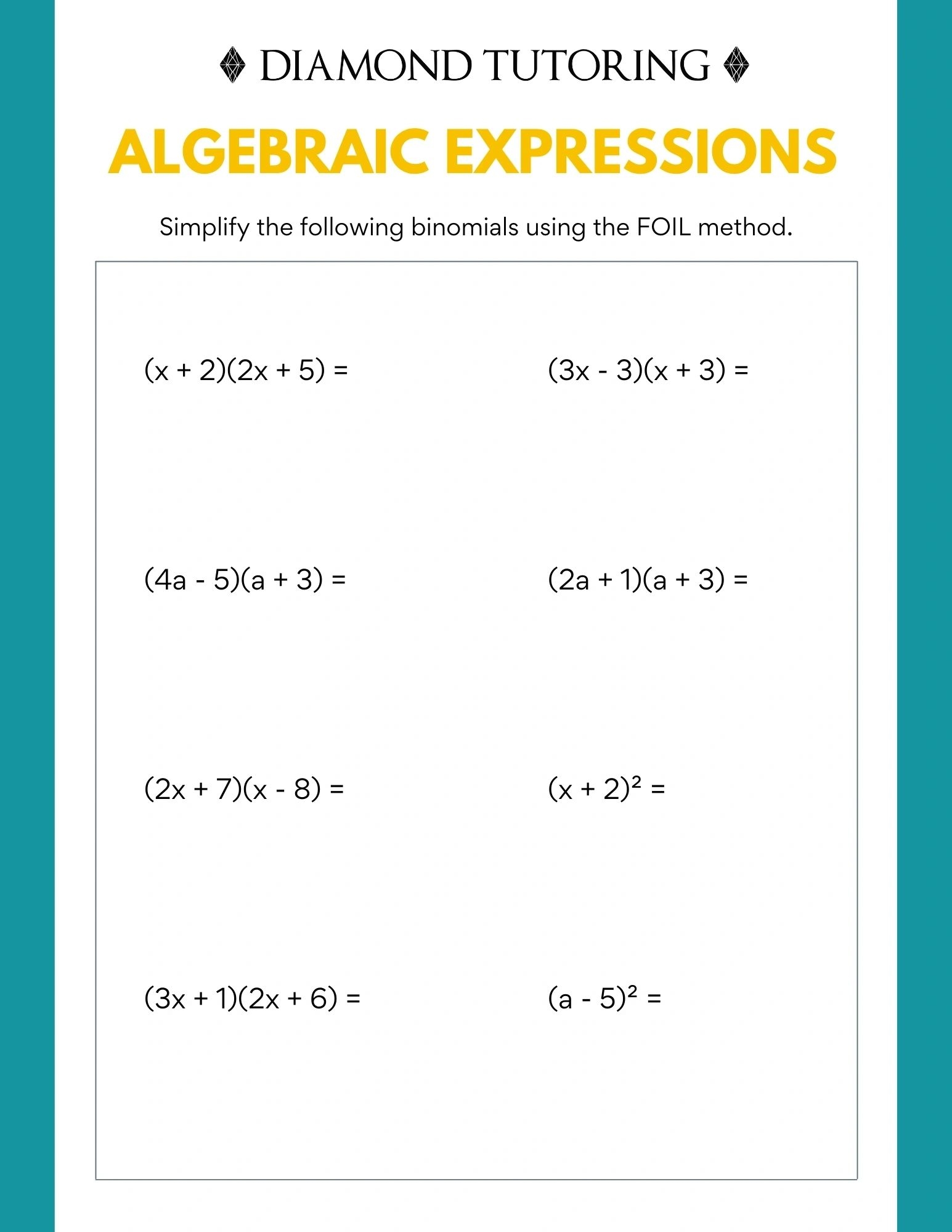 With this printable quiz, you’ll have the chance to practice multiplying binomials using the foil method. Each question will present you with two binomials to multiply, and you’ll need to apply the foil method to find the correct answer.
