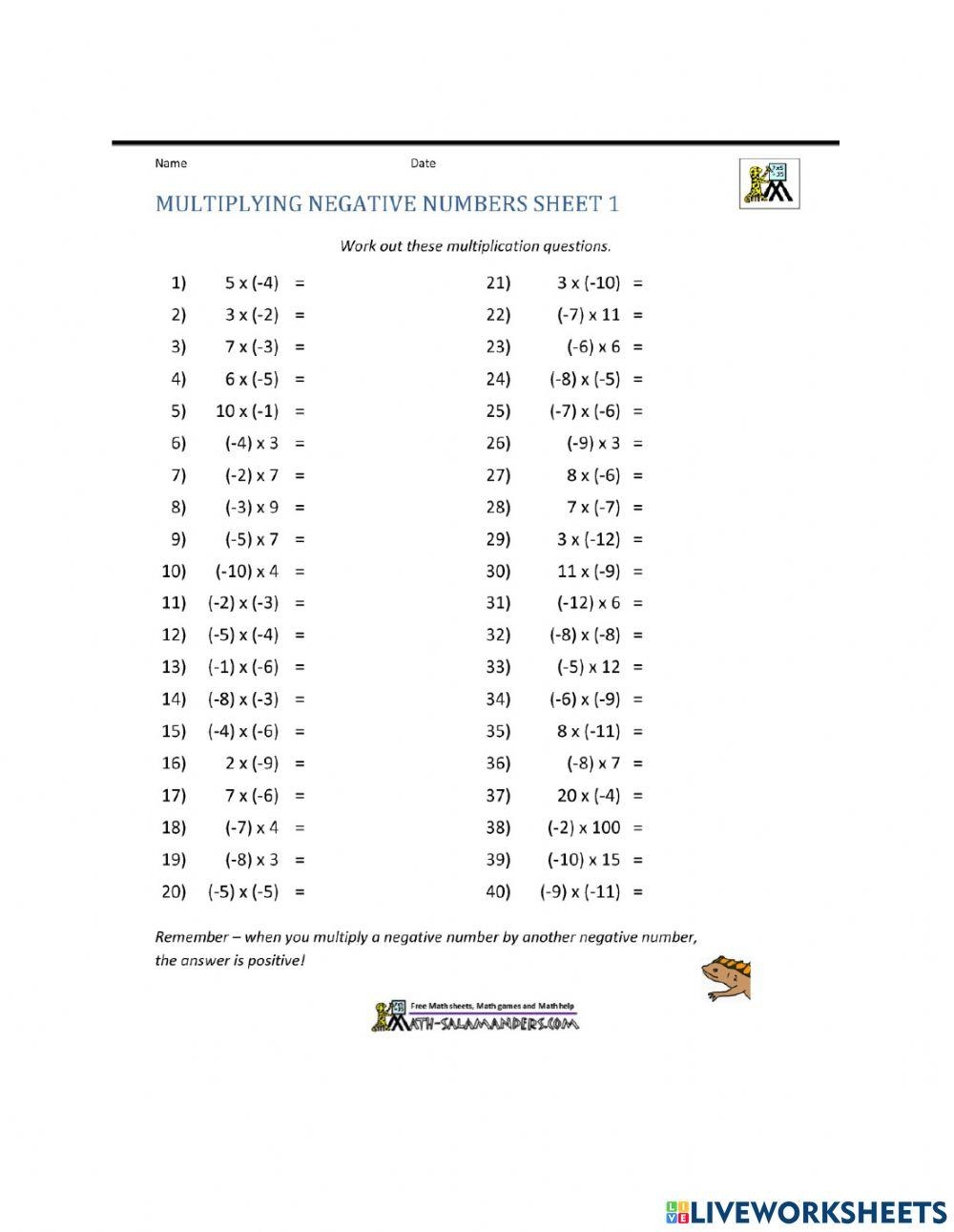 Multiplying Negative Numbers Quiz Printable