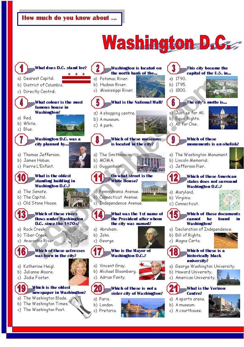 Explore the rich history and fascinating facts about Washington DC with these printable trivia questions. Whether you are a local or a visitor, these questions will help you discover new information and appreciate the beauty of the capital city even more. So, get ready to test your knowledge and have fun with these Washington DC trivia questions!