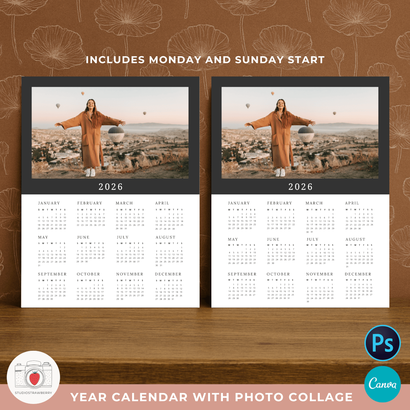 2026 Photo Calendar Template For Canva amp Photoshop Strawberry Kit